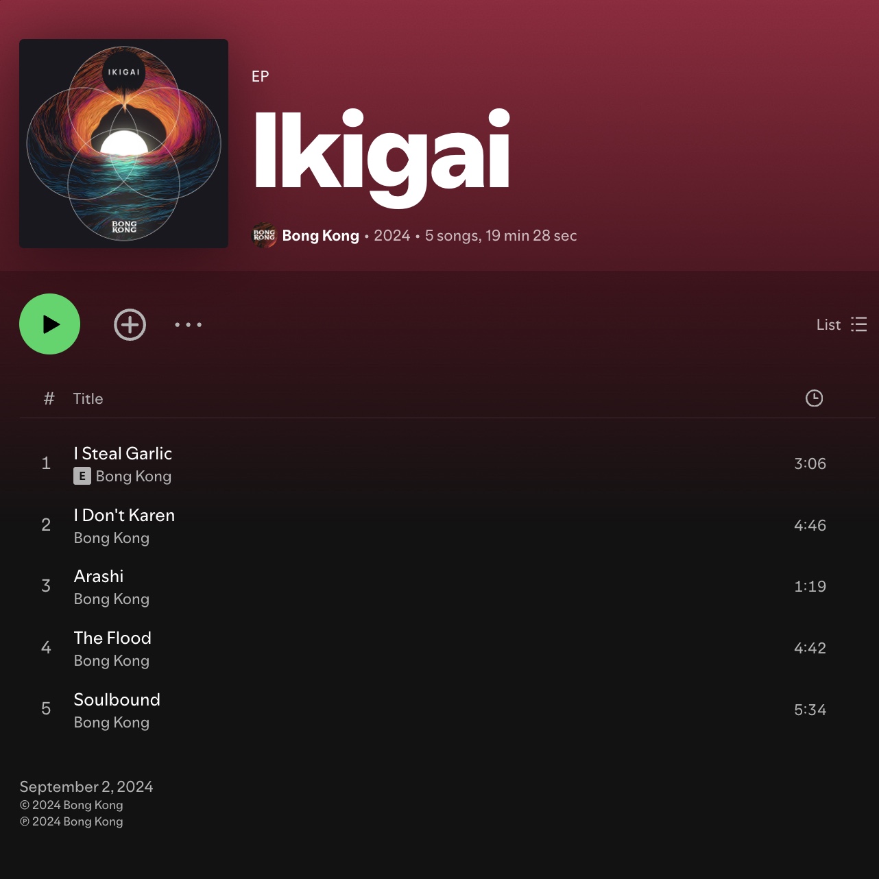 IKIGAI, 生き甲斐, is a Japanese concept that means a reason for being—it's about living with purpose and passion. It represents the spot where what you love, what you're good at, what the world needs, and what you can be paid for overlap. When Bong Kong reached out, they already had a strong vision for their EP cover, they just needed a little help bringing it to life—and this is the final result: